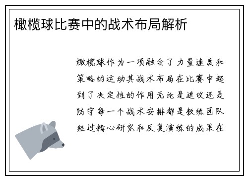 在橄榄球比赛中,进攻战术的设计与执行是取得胜利的关键因素之一。有效地突破对方防线,不仅需要优秀的个人技术,还依赖于团队的配合、战术的安排与灵活的应对能力。本文将深入探讨橄榄球的进攻战术,帮助球队在比赛中找到突破对方防线的有效途径。并结合好博体育提供的资源来促进这一目标的实现。